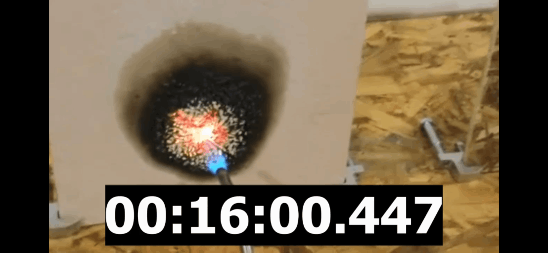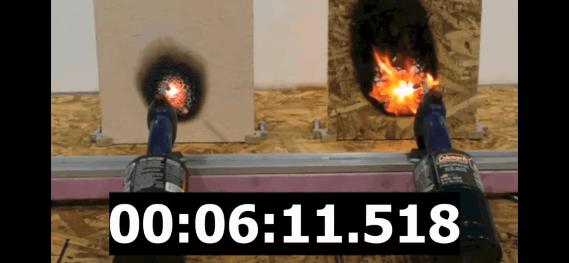We tested RexBoard vs. uncoated OSB to demonstrate the difference between the two when exposed to an open fire. We gave a head start to the uncoated OSB and began burning RexBoard 20 seconds + before igniting the torch for the uncoated OSB.